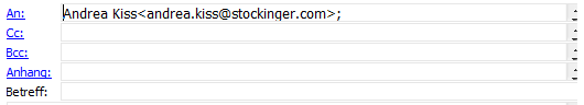 Dieser Vorgang kann auch in den Feldern "Cc" und "Bcc" wie auch im Feld "An" beliebig oft wiederholt werden. Es können aber auch Empfänger eingetragen werden, die nicht in der WinLine angelegt sind. In diesem Fall werden keine zusätzlichen Informationen angezeigt.