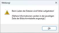 In der Spalte "Status" wird eine Meldung ausgegeben, wenn beim Öffnen des Menüpunkts die Meldung angezeigt wurde, dass nicht alle Dateien geladen werden konnten.