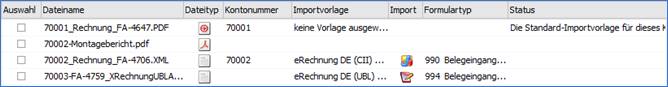 An dieser Stelle wird definiert, mit welcher Importvorlage die E-Rechnung importiert werden soll. Konnte die Kreditorennummer aus der E-Rechnung ermittelt werden oder wurde manuell ein Kreditor in die Spalte "Kontonummer" eingetragen, wird die Importvorlage aus dem E-Billing Schema vorbelegt, falls dort eine Vorlage hinterlegt wurde.