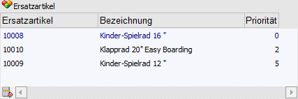 In der Tabelle können weitere Ersatzartikel mit unterschiedlichen Prioritäten hinterlegt werden. In der ersten Zeile (blaue Schrift) wird immer der Artikel angezeigt, welcher als Hauptersatz definiert wurde (hinterlegt im Artikelstamm, Feld "Ersatzzartikel"). Dieser erhalt automatisch die Priorität 0 (höchste Priorität).