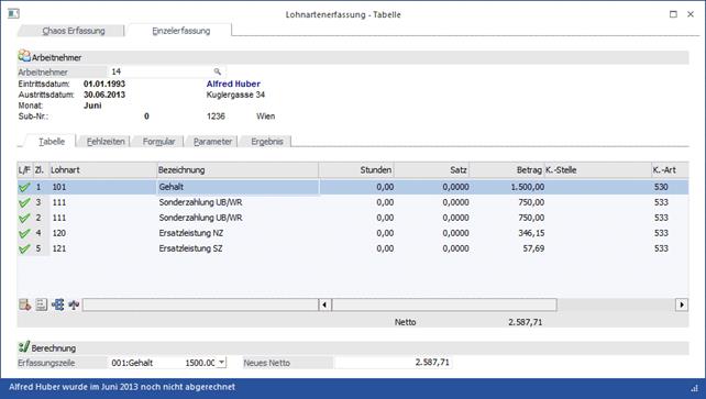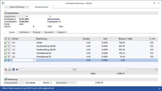 Der AN 14 - Herr Alfred Huber tritt mit 15. Juni 2013 aus. Er hat einen laufenden Normal-Bezug von 1.500,- und erhält noch Ersatzleistungen für 6 Werktage (+ 1 SZ-Tag). Es wurden noch keine Sonderzahlungen ausbezahlt.