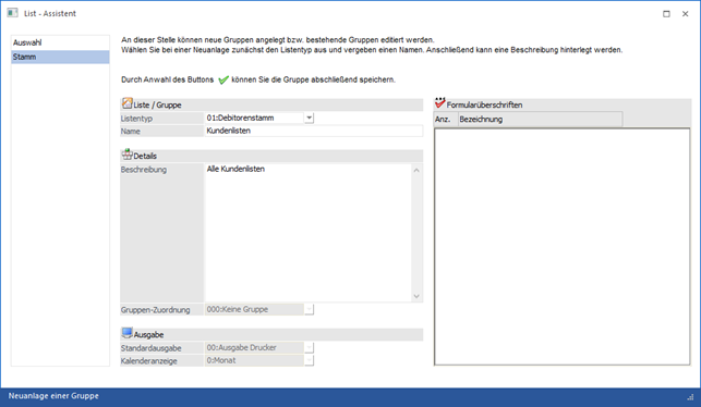 Gruppen dienen dazu, um mehrere Listen, die innerhalb eines Datentyps (Debitorenstamm, Statistik etc.) besser gliedern zu können und die Auswahl von bestehenden Listen zu vereinfachen.