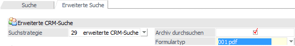 Es wurde die zuvor angelegte Suchstrategie "29 - erweiterte CRM-Suche" unter "Suchstrategie" hinterlegt und die Option ""Archiv durchsuchen" aktiviert. In dem erscheinenden Feld "Formulartyp" kann nun ein Formulartyp aus dem Archivbereich gewählt werden.