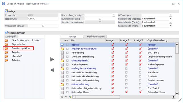 Für die Anlage von Vorlagen (CRM und Personenkonten) gibt es einen neuen Feldtyp "Erweiterungsfelder".