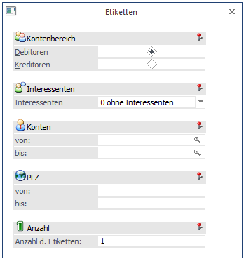 In der WinLine ist der Druck der Adressen von Kreditoren und Debitoren auf Endlos-Etiketten möglich. Der Ausdruck erfolgt auf einbahnigen Etiketten bzw. falls pro Debitor / Kreditor mehrere Etiketten erforderlich sind, kann auch ein mehrbahniger Ausdruck im Lautbild festgelegt werden.