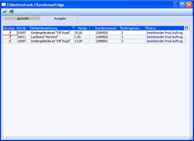 Nach Drücken des OK-Buttons gelangt man in das zweite Register "Ausgabe", in dem alle der Selektion entsprechenden Artikel für den Etikettendruck vorgeschlagen werden.