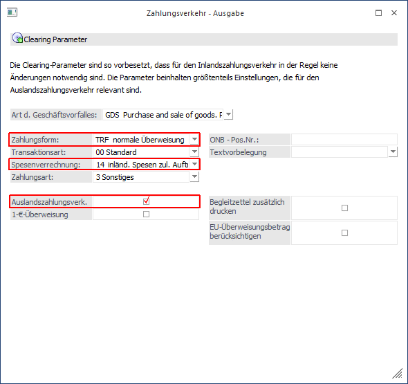 ü Spesenverrechnung - Bei der Spesenverrechnung muss die Option "14 inländ. Spesen zul. Auftragg. Ausländ. Spes. Zul. Empf." gewählt werden, damit werden die Spesen je nach Aufwand an Absender und Empfänger aufgeteilt.