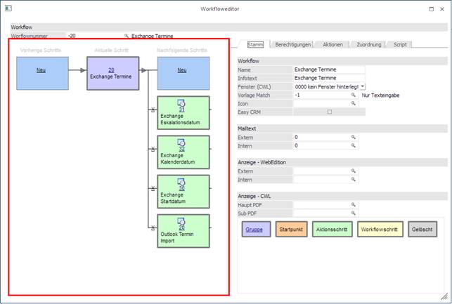 Es wurde eine Workflow-Gruppe "Exchange" angelegt, die sich in die Aktionsschritte