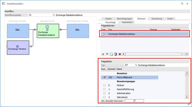 Im Workflow-Editor wird bei den Folgeaktionstypen 85, 65, 87 (Exchange-Startdatum, -Kalenderdatum und -Eskalationsdatum) eine Tabelle mit Benutzer und Benutzergruppen angzeigt, mit denen eine Vorbelegung für das Schreiben eines Exchange-Termins getroffen werden kann. Zudem kann hinterlegt werden, dass die Synchronisation inkl. aktuellem Benutzer durchgeführt werden soll.