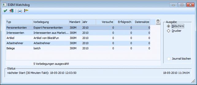 In der Statuszeile wird angezeigt, wann der nächste "Start" erfolgt, sowie die aktuelle Uhrzeit. Der OK-Button "Sofort Starten" exekutiert sofort den Datentransfer. Die Daten der EXIM-Läufe werden gespeichert und können mittels Journal-Button ausgewertet werden. Das Journal kann auf Bildschirm oder Drucker ausgegeben werden. Mittels Checkbox wird gesteuert, ob nach dem Druck das Journal gelöscht werden soll oder nicht. Folgende Informationen werden hier gedruckt: Zeit, Vorlagentyp, Vorbelegungsbezeichnung, Erfolgreich JA/NEIN, erfolgreiche Datensätze, fehlerhafte Datensätze.