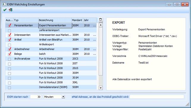 Durch Aktivieren der Checkbox auf der linken Seite wird der entsprechende Eintrag für die automatische Abarbeitung in das Fenster "EXIM Watchdog" vorgesehen.