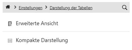 Auf Geräten mit kleineren Bildschirmen (z.B. Smartphones) können Inhalte klassischer Tabellen nicht komplett dargestellt werden und zum Einblenden nicht sichtbarer Elemente muss erst nach Links/Rechts gescrollt werden. Bei der kompakten Tabellenansicht wird der Inhalt der Tabelle mittels Titel/Untertitel/Icon in einer übersichtlichen Form dargestellt.