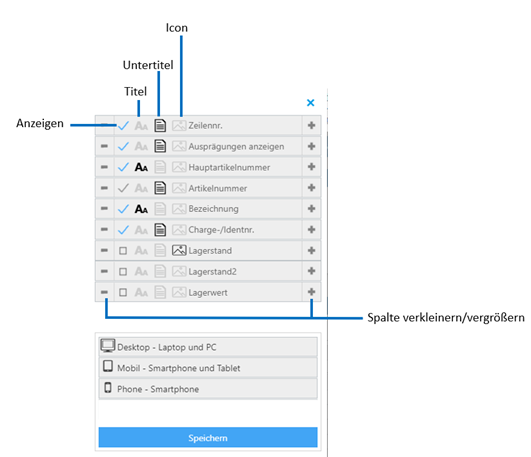 Wird die WinLine auf einem mobilen Endgerät genutzt, kann der Rechtsklick über langes Antippen mit dem Finger ausgelöst werden und so die Funktion "Spalten anzeigen/verstecken" geöffnet werden. In diesem Menü kann, genau wie in der WinLine definiert werden, welche Informationen als Titel, Untertitel und Icon jeweils für Desktop / Tablet / Phone angezeigt werden sollen, ebenso ist es möglich die Spaltenbreite anzupassen, sowie die Spaltenreihenfolge per Drag & Drop zu verändern.