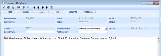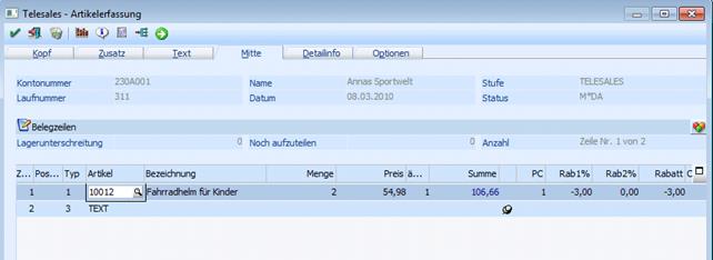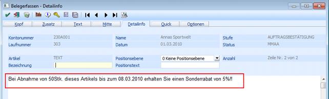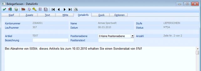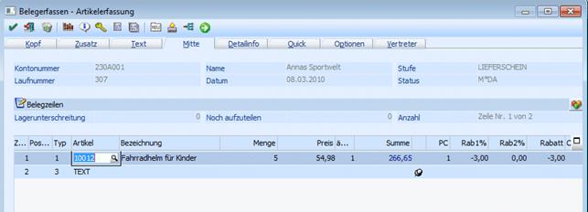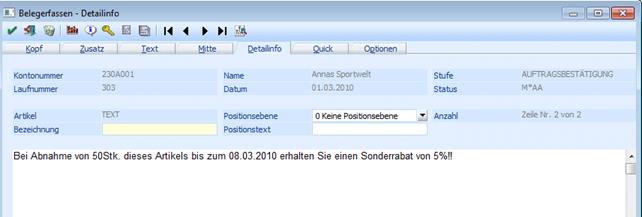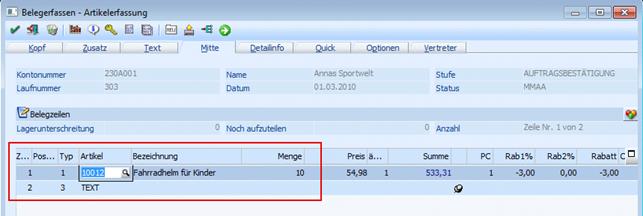 In der Belegerfassung ist am 01.03.2010 ein Auftrag mit einer Artikelposition und einem Text erfasst worden: