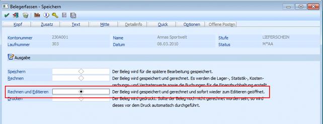 Anschließend wird mit Ok bzw. F5 bestätigt. Im Speichern-Fenster wird die Option "Rechnen und Editieren" aktiviert und mit Ok bzw. F5 bestätigt, weil der Textbaustein verändert werden soll und diese Änderung nicht in den Auftrag übernommen werden soll: