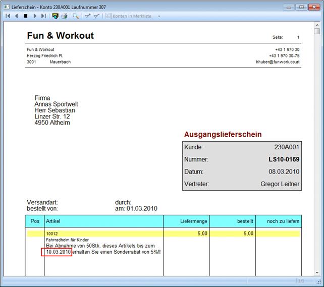 Der Teillieferschein wird mit dem geänderten Datum 10.03.2010 gedruckt: