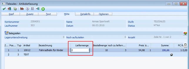 Im Telesales wird der Auftrag mit der Laufnummer 303 aufgerufen. Die Liefermenge wird von 5 Stk. auf 2 Stk. verändert:
