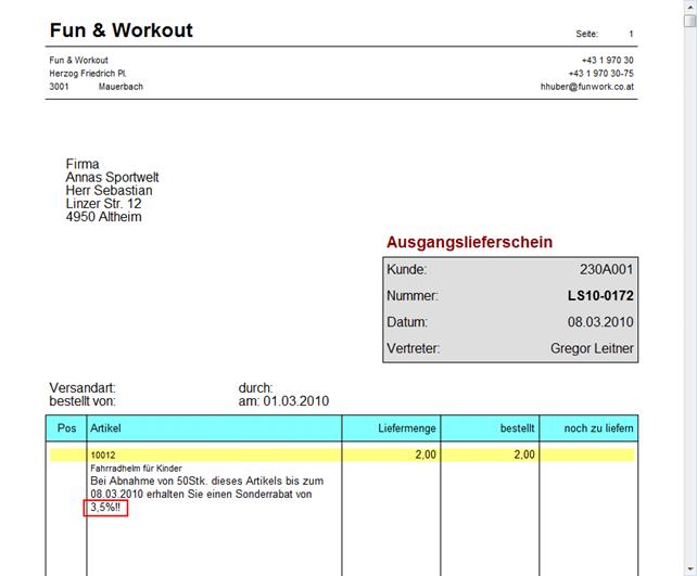 Der Teillieferschein wird mit dem geänderten Prozentsatz 3,5% gedruckt:
