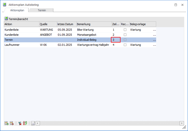 Dort kann im Feld "Autobeleg" via Matchcode aus den Aktionen jene gewählt werden, die mit dem Beleg verbunden werden soll. Die Auswahl erfolgt durch Doppelklick auf die Zeilennummer in der Aktionstabelle.