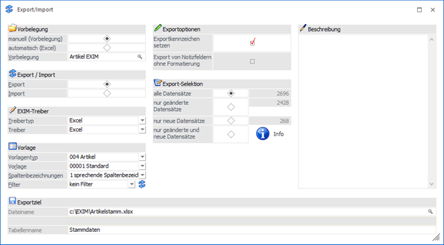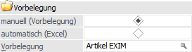 An dieser Stelle muss zunächst die Vorbelegungsvariante definiert werden, d.h. ob ein klassisches ex- bzw. importieren von Daten gewünscht ist oder ein EXIM mit direktem Editieren.