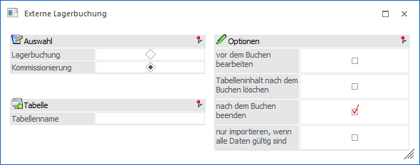 Mit der Option "Kommissionierung" können Kommissionierungsbuchungen aus einer extra angelegten SQL-Tabelle importiert werden. Beim Import von Kommissionierungsbuchungen werden: