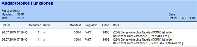 Wenn der Button angeklickt wird und die Tabelle ist noch nicht vorhanden, werden auch 2 Fehlermeldungen in das Auditprotokoll-Funktionen geschrieben (Ampel schaltet auf Gelb):