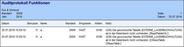 Wenn der Button angeklickt wird und die Tabelle ist noch nicht vorhanden, werden auch 2 Fehlermeldungen in das Auditprotokoll-Funktionen geschrieben (Ampel schaltet auf Gelb):
