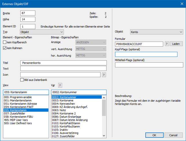 Um Informationen zu einem Personenkonto anzuzeigen, muss WinLine wissen, wie die Kontonummer lautet. Woher diese stammt, wird über das Feld "Text" oder den Bereich "Var / View" zugeordnet.