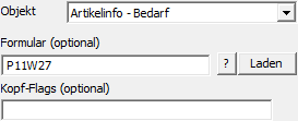 Mit Hilfe des Objekts "Artikelinfo - Bedarf" können die Bedarfszeilen (Disposition) eines Artikels ausgegeben werden. Welche Informationen dabei genau angedruckt werden sollen, wird über ein extra Formular gesteuert. Als Key dient die "Artikelnummer" (d.h. Feld "Text" oder Bereich "View / Var" muss gefüllt sein).