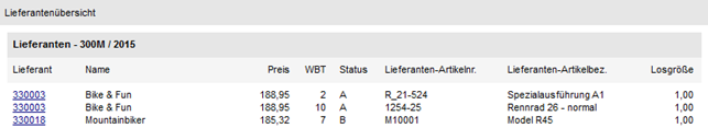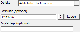 Mit Hilfe des Objekts "Artikelinfo - Lieferanten" können die Lieferanten eines Artikels ausgegeben werden. Welche Informationen dabei genau angedruckt werden sollen, wird über ein extra Formular gesteuert. Als Key dient die "Artikelnummer" (d.h. Feld "Text" oder Bereich "View / Var" muss gefüllt sein).