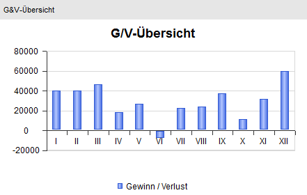 Mit Hilfe des Objekts "G&V-Übersicht Grafik" kann der Gewinn / Verlust pro Periode grafisch ausgegeben werden. Welche Informationen dabei genau angedruckt werden sollen, wird über ein extra Formular gesteuert. Es handelt sich hierbei um ein mandantenbezogenes Objekt (d.h. Feld "Text" oder Bereich "View / Var" darf nicht gefüllt sein).