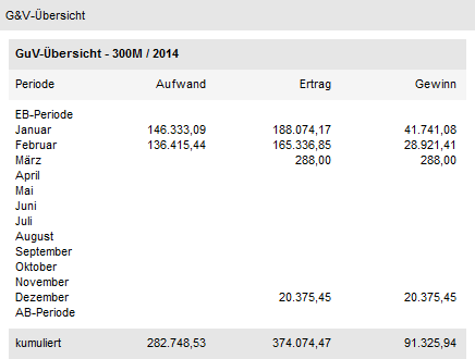 Mit Hilfe des Objekts "G&V-Übersicht" können die Summen der Aufwände und Erlöse, sowie der Gewinn / Verlust pro Periode und kumuliert ausgegeben werden. Welche Informationen dabei genau angedruckt werden sollen, wird über ein extra Formular gesteuert. Es handelt sich hierbei um ein mandantenbezogenes Objekt (d.h. Feld "Text" oder Bereich "View / Var" darf nicht gefüllt sein).