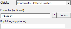 Mit Hilfe des Objekts "Konteninfo - Offene Posten" können die Offenen Posten eines Personenkontos ausgegeben werden. Welche Informationen dabei genau angedruckt werden sollen, wird über ein extra Formular gesteuert. Als Key dient die "Kontonummer" eines Personenkontos (d.h. Feld "Text" oder Bereich "View / Var" muss gefüllt sein).