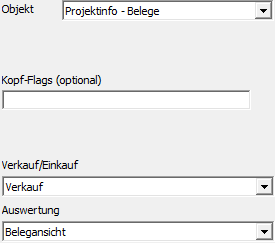 Mit Hilfe des Objekts "Projektinfo - Belege" können die Belege eines Projekts ausgegeben werden. Als Key dient die "Projektnummer" (d.h. Feld "Text" oder Bereich "View / Var" muss gefüllt sein).