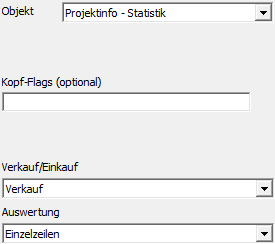 Mit Hilfe des Objekts "Projektinfo - Statistik" kann die Statistik eines Projekts ausgegeben werden. Als Key dient die "Projektnummer" (d.h. Feld "Text" oder Bereich "View / Var" muss gefüllt sein).