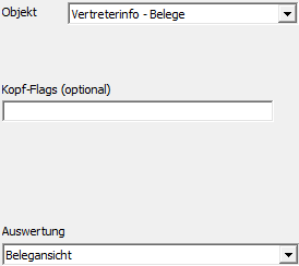 Mit Hilfe des Objekts "Vertreterinfo - Belege" können die Belege eines Vertreters ausgegeben werden. Als Key dient die "Vertreternummer" (d.h. Feld "Text" oder Bereich "View / Var" muss gefüllt sein).