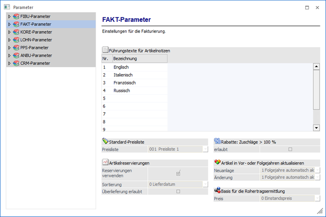 FAKT-Parameter - Artikel - Erweiterte Optionen