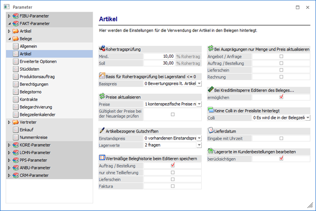Über den Bereich "FAKT-Parameter - Belege - Artikel" können allgemeine Einstellungen für die Verwendung von Artikeln in der Belegerfassung der WinLine FAKT vorgenommen werden.