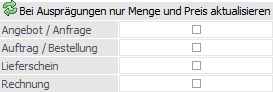 Ist dieses Programmverhalten nicht gewünscht, so kann an dieser Stelle (pro Belegstufe) das Löschen und Einfügen durch ein Aktualisieren ersetzt werden. Hierdurch wird nur noch die Menge und die Preisdaten aus dem Fenster "Ausprägungen erfassen" in die Belegmitte übernommen.