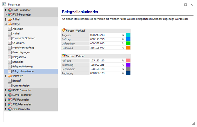 In diesem Bereich kann für jede Belegstufe - sowohl für Ein-, als auch für Verkauf - eine Farbe hinterlegt werden, welche in weiterer Folge im WinLine LIST - Beleg- bzw. Belegzeilenkalender Anwendung findet.