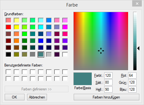 Hier besteht die Mögichkeit, individuelle Farben zusammenzustellen. Mit OK wird die ausgewählte Farbe in die entsprechende Belegstufe übernommen.