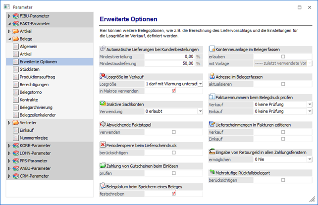 Über den Bereich "FAKT-Parameter - Belege - Erweiterte Optionen" können weitere allgemeine Einstellungen für die Belegerfassung der WinLine FAKT vorgenommen werden.