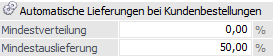 Eingabe des Mindestverteilungsprozentsatzes, d.h. es müssen mindestens xx Prozent des Gesamtauftrages geliefert werden, sonst wird der Auftrag in dem Programm "Kundenbestellungen bearbeiten" gar nicht zur Auslieferung vorgeschlagen (hierbei spielt natürlich auch noch die Option "Teillieferung erlaubt" aus dem Personenkontenstamm - Register "FAKT" - bzw. der Belegart eine Rolle).