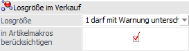 Mit dieser Option kann definiert werden, was bei Unterschreitung der im Artikelstamm (Register "Preise" - Unterregister "Preise") hinterlegten Losgröße im Verkauf (d.h. Erfassung von Verkaufsbelegen oder Kontrakten) passieren soll.