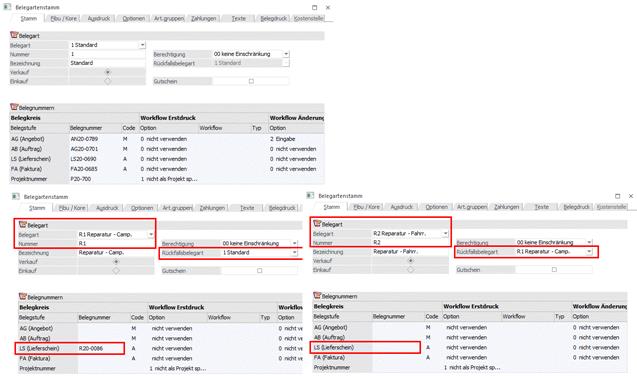 Für Reparaturlieferungen sind die eigenen Belegarten (R1 und R2) angelegt, wobei Belege mit diesen Belegarten einen gemeinsamen Nummernkreis für die Belegstufe "Lieferschein" besitzen sollten.