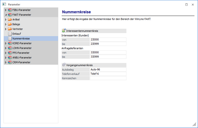 Über den Bereich "FAKT-Parameter - Nummernkreise" können spezielle Nummernkreise für die WinLine FAKT hinterlegt werden.