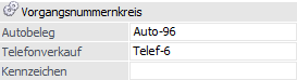 In diesen Feldern muss für die Durchführung des Autobeleges und des Telefonverkaufes zwingend eine Vorgangsnummer hinterlegt werden. Wenn ein Eintrag vorhanden ist, wird beim Starten des Autobeleg- bzw. Telefonlistenfensters als Vorgangsnummer die nächsthöhere Nummer vorgeschlagen. Beim Starten des Duplikationslaufes wird diese Vorgangsnummer dann zurückgeschrieben.
