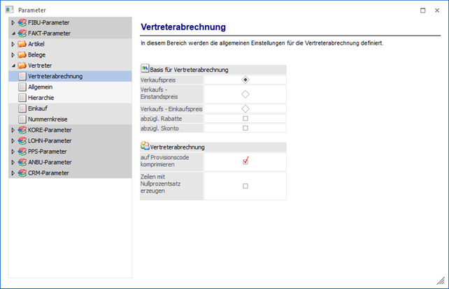 Über den Bereich "FAKT-Parameter - Vertreter - Vertreterabrechnung" können die allgemeinen Einstellungen für die Vertreterabrechnung definiert werden.