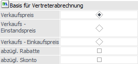 Mit dieser Einstellung kann bestimmt werden, mit welcher Basis die Vertreterabrechnung durchgeführt werden soll. Dabei gibt es 3 Möglichkeiten: