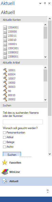 Hier werden die letzten 20 verwendeten Personenkonten pro Mandanten angezeigt. Durch einen Klick auf die Kontonummer (DrillDown) wird das Programm WinLine INFO geöffnet, wo dann die Kontoinfo ersichtlich ist. Wird die Kontonummer mit der rechten Maustaste angewählt so stehen 2 Funktionen zur Auswahl: